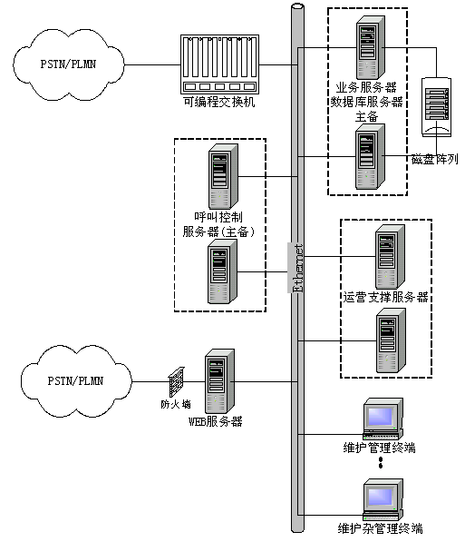 數(shù)據(jù)庫(kù)服務(wù)器是系統(tǒng)的系統(tǒng)數(shù)據(jù)和呼叫記錄(CDR)的數(shù)據(jù)儲(chǔ)存單元,支持SQL Server 2000、Oracle、Sybase等通用關(guān)系數(shù)據(jù)庫(kù)。用戶數(shù)據(jù)備份可提供數(shù)據(jù)庫(kù)自身備份方式、數(shù)據(jù)庫(kù)熱備份冗余方式。