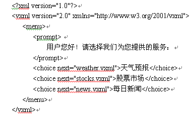 下面是一個(gè)VoiceXML簡(jiǎn)單例子。當(dāng)用戶與電話語(yǔ)音系統(tǒng)接通以后,將會(huì)聽(tīng)到語(yǔ)音合成的提示"用戶您好!請(qǐng)選擇我們?yōu)槟峁┑姆⻊?wù):" 。當(dāng)用戶說(shuō)"股票市場(chǎng)"