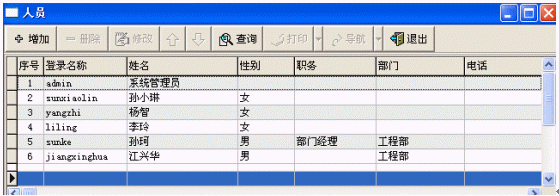 人員管理主要是對本系統(tǒng)的使用者進(jìn)行管理(增加/修改/刪除/查詢),包括使用者所在的部門、職務(wù)等
