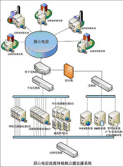 2004年10月隨著四川眉山電信公司寬帶網(wǎng)建設(shè)的日益完善和寬帶接入業(yè)務(wù)的迅速發(fā)展,公司原先擁有一套簡(jiǎn)單的流媒體服務(wù)系統(tǒng),從功能和性能上都不能滿(mǎn)足業(yè)務(wù)的需要,公司決定建設(shè)一套運(yùn)營(yíng)級(jí)的流媒體視頻服務(wù)系統(tǒng),提供3000個(gè)并發(fā)的視頻點(diǎn)播服務(wù)和8路的網(wǎng)絡(luò)電視直播、并提供DRM文件的加密下載。