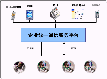 統(tǒng)一通信平臺提供了與企業(yè)內(nèi)部交換機(PBX)或PSTN,寬帶或INTERNET和GSM或GPRS網(wǎng)絡的接口,融合了多種網(wǎng)絡資源和企業(yè)內(nèi)部數(shù)據(jù)源。為用戶提供了多種服務界面:WEB界面、人工服務界面,IVR界面。同時為用戶提供短信息等數(shù)據(jù)業(yè)務。