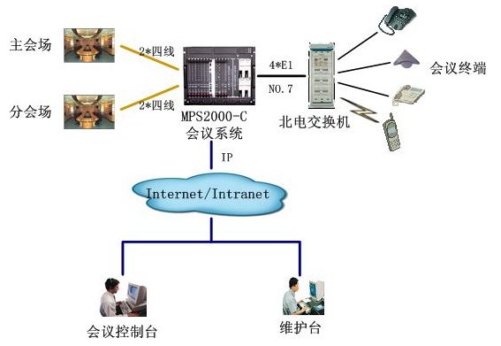 該會議系統(tǒng)通過4個數(shù)字中繼,與北電用戶交換機互連,采用PRI信令。與視頻會議系統(tǒng)主會場采用四線音頻接口接主會場調音臺,保證與視頻會議系統(tǒng)音頻的無縫對接。通過以太網(wǎng)口與局域網(wǎng)連接,實現(xiàn)維護管理及會議控制等功能。