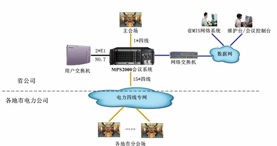 該會議系統(tǒng)是安徽省公司與地市電力公司“一主兩備”系統(tǒng)的電話會議系統(tǒng)備份系統(tǒng),通過2個(gè)數(shù)字中繼與省通信公司用戶交換機(jī)互連,采用NO.7信令。16路4線中1路接主會場調(diào)音臺,實(shí)現(xiàn)會議室擴(kuò)音設(shè)備的接入,其余15路接各地市電力公司原四線專網(wǎng)資源連接,通過以太網(wǎng)口與D-LINK網(wǎng)絡(luò)交換機(jī)互連,接入安徽省電力的數(shù)據(jù)網(wǎng),實(shí)現(xiàn)實(shí)時(shí)維護(hù)管理及會議控制等功能。