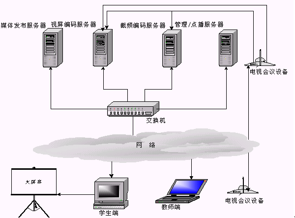 當老師端在異地時(攝像頭離服務(wù)器較遠,無法物理連接),可通過"電視會議系統(tǒng)"將老師的圖像及聲音實時傳送到編碼服務(wù)器,桌面課件可以通過PcAnywhere傳送到編碼服務(wù)器。圖像,聲音和桌面課件通過Web Streaming采集壓縮并在網(wǎng)上實時廣播。這種系統(tǒng)架構(gòu)也是當今功能比較齊全和完善的一種實現(xiàn)方式。