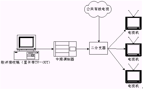 本系統(tǒng)接收端接收實時廣播時,除了用普通PC機收看,或把PC機接收到的信號輸?shù)诫娨暎ù笃粒┥鲜湛,甚至還可以接入有線電視網(wǎng)進行播放。具體方法是通過一個接收端接收股評節(jié)目,通過帶TV-OUT的顯卡把TV信號輸出到中頻調(diào)制設(shè)備,中頻調(diào)制設(shè)備可以把基帶模擬信號轉(zhuǎn)換成一個有線電視信號,且傳輸距離遠,損失小,再把這個信號與有線電視信號一起接入一個二分支器(2進1出),這就可以和公共有線電視共存,形成自己的頻道,供電視接收。