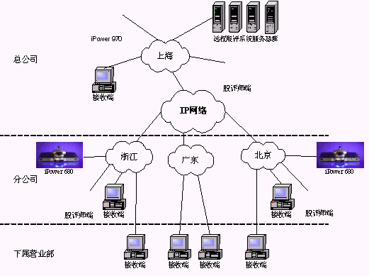 某證券公司有三級網(wǎng)絡(luò),總公司、分公司和下屬營業(yè)部。總公司到分公司帶寬是2M,在總公司配置一套會議室型電視會議終端POLYCOM 970和一套多點會議服務(wù)器Radvision ViaIP400。在分公司配置了38套會議室型電視會議終端POLYCOM 680,用于與總公司進行雙向視頻會議。分公司到營業(yè)部帶寬是512K,各營業(yè)部安裝遠程股評系統(tǒng)接收端程序,遠程股評系統(tǒng)服務(wù)器都放置在海通總公司。當在總公司進行股評時,總公司本地攝像頭拍攝教師畫面,MIC采集教師聲音,傳給服務(wù)器編碼,再通過網(wǎng)絡(luò)供各個接收端接收;當在分公司進行股評時,首先分公司的電視會議設(shè)備采集教師畫面及聲音傳回總公司的電視會議設(shè)備,再傳給遠程股評系統(tǒng)的服務(wù)器進行編碼,然后通過網(wǎng)絡(luò)發(fā)布,供接收端接收。(結(jié)構(gòu)如下圖)