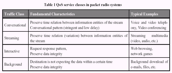 3G無線傳輸堆棧通常由二種不同類型的輸送介質(zhì)組成,專用和共享信道。然而,使用專用信道用戶可以獲得固定帶寬用于傳輸數(shù)據(jù),但使用共享信道用戶只有在動態(tài)的帶寬下傳輸數(shù)據(jù),類似于ATM或GSM GPRS。HSDPA將會成為共享信道在空中的一個擴展。除了MMS,在3G系統(tǒng)的初始階段所有的流媒體和會話應用都希望使用專用信道。 在現(xiàn)代的系統(tǒng)設計中,一個應用可以請求許多不同的服務質(zhì)量(QoS)級別的其中之一。服務質(zhì)量級別包含最大誤碼率、最大延遲和最大保證的帶寬等參數(shù)。此外,通常根據(jù)不同的應用分為不同的服務級別:會話應用、流媒體應用、交互應用以及后臺通信應用。特性和典型的例子見表1。