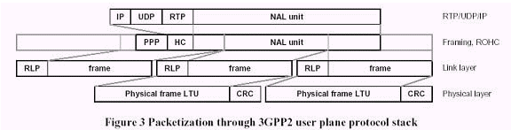 因為包交換服務,3GPP/3GPP2同意了一個基于IP的協(xié)議棧。圖3展示了一個NAL單元通過3GPP2用戶平面協(xié)議堆棧被封裝在RTP/UDP/IP的典型過程。在頭壓縮(RoHC)后,此IP/UDP/RTP包被封裝進一個PDCP/PPP2包,變成了頻率鏈路控制(RLC)和服務數(shù)據(jù)單元(SDU)。RLC協(xié)議可以在三種模式下工作:透明、非確認和確認模式。RLC協(xié)議為用戶和數(shù)據(jù)提供分段和重傳服務。在透明和非確認模式,RLC被定義為單向的;在確認模式,RLC被定義為雙向的。對於所有的RLC模式,循環(huán)冗余檢查(CRC)的錯誤檢測在物理層上被運行,而且CRC檢查的結(jié)果和真實的數(shù)據(jù)一起被遞送到 RLC。在透明模式中,沒有上層的協(xié)議被增加到較高層的數(shù)據(jù)中。錯誤的協(xié)議數(shù)據(jù)單元(PDUs)可以被丟棄或標記為錯誤。在非確認模式中,沒有重傳協(xié)議在使用中,而且數(shù)據(jù)傳送沒有保證。接受到的錯誤數(shù)據(jù)根據(jù)配置來決定丟棄或標記為錯誤。在確認模式中,一種自動的重復請求機制被用于錯誤訂正。