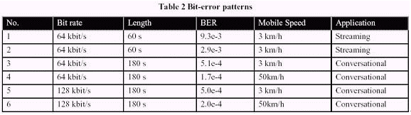 在H.264/AVC的標準化進程中,移動視頻傳輸?shù)闹匾砸呀?jīng)在3G移動傳輸里面通過對基于H.324M的電路交換會話服務、包交換會話和流服務得到了證實。這些測試情況允許適當?shù)木幋a特征、測試和容錯仿真等特征的選擇,同時也可以得到有意義的測試結(jié)果。在本文,我們將會把重心集中在基于IP的測試情況。在正常的測試情況下,我們會定義6個測試情形組合,主要測試通過3G移動網(wǎng)絡的包交換會話服務和包交換流媒體服務。另外,測試環(huán)境包括簡單的脫機3GPP/3GPP2仿真軟件、程序接口和評估標準。無線信道使用專門生產(chǎn)用于移動無線信道仿真的位率差錯模板來進行仿真。 位率差錯模板在物理層上和RLC/RLP層下來捕獲,因此,它們在實驗被用于物理層仿真。通過位率差錯模板實驗中得出的碼率、長度、位錯誤率和移動速度數(shù)據(jù)詳見下表2。