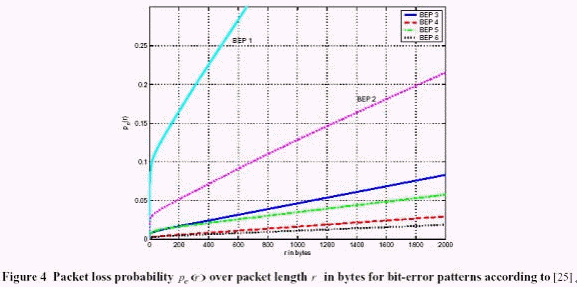 數(shù)組3到6的仿真結(jié)果更可靠,在會話應用中需要低錯誤率的運送者。 假定一任意的字節(jié)的開始位置在文件包可能發(fā)生錯誤的位置里面。 這些錯誤可能性的所有數(shù)據(jù)錯誤在圖4中被顯示。 明顯可以看出錯誤率會因為包長度的增加而提高。從位率錯誤表格(BEP1和2)可知,當包長度減少的時候丟包率是不可以接受的, 舉例來說,500個字節(jié), 丟失可能性高達25%. 高的錯誤率需要在鏈路層上重傳。