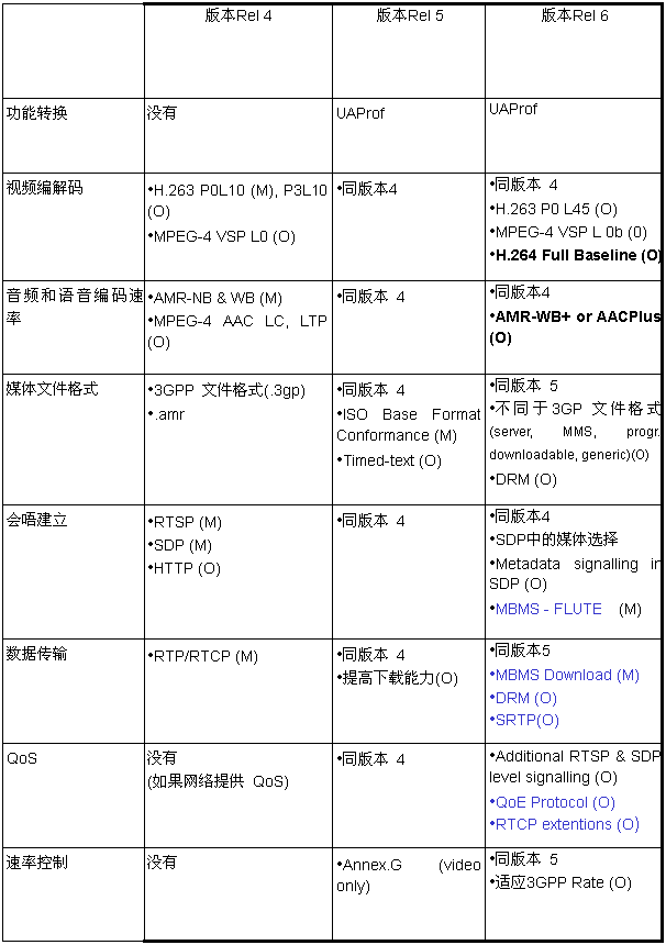 - 3GPP PSS隨著內(nèi)在的向后兼容性,從簡單的流式媒體服務(wù)規(guī)范(版本Rel 4)發(fā)展到更先進(jìn)一代的服務(wù)規(guī)范(版本Rel 6)。