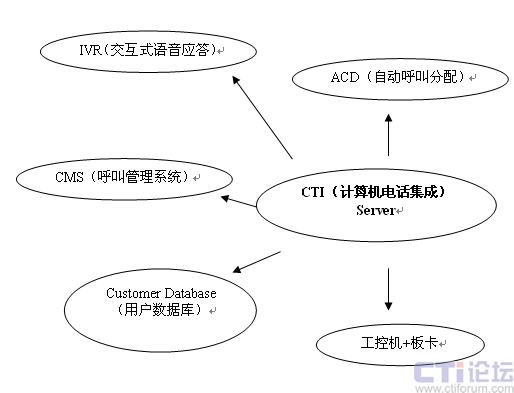以CTI(計(jì)算機(jī)電話(huà)集成)為核心模塊,實(shí)現(xiàn)對(duì)IVR(交互式語(yǔ)音應(yīng)答)、ACD(自動(dòng)呼叫分配)、CMS(呼叫管理系統(tǒng))、板卡+工控機(jī)、Customer