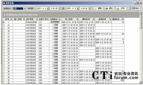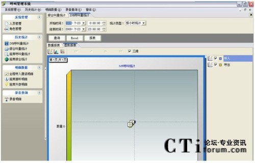 系統(tǒng)提供統(tǒng)計(jì)報(bào)表生成工具,實(shí)現(xiàn)對(duì)系統(tǒng)訪問(wèn)次數(shù)的統(tǒng)計(jì)與分析,并以圖示直觀地反映出用戶(hù)關(guān)注的熱點(diǎn)。可按主叫號(hào)碼、局向統(tǒng)計(jì)時(shí)長(zhǎng),并自動(dòng)生成效果圖,直觀表現(xiàn)業(yè)務(wù)發(fā)展。還可根據(jù)主叫統(tǒng)計(jì)時(shí)長(zhǎng),當(dāng)天分析,本周分析,本月分析,提供時(shí)長(zhǎng)走勢(shì)圖(可以以小時(shí)為單位分析時(shí)長(zhǎng)的走勢(shì),也可以以天為單位分析時(shí)長(zhǎng)的走勢(shì))