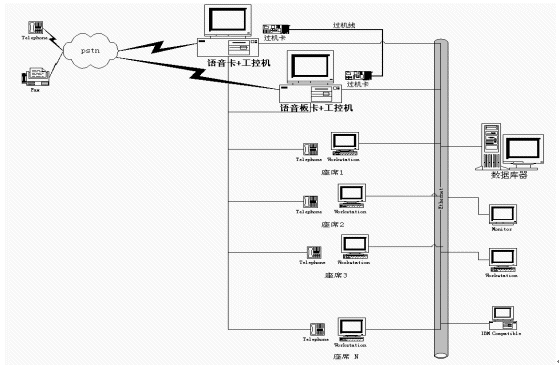 在一些小型CALL CENTER系統(tǒng)中,人們通常通過語音板卡加工控機(jī)的方式搭建系統(tǒng),通常一臺設(shè)備就集成了ACD、IVR、CTI等各種資源,各資源的使用、調(diào)派通過軟件進(jìn)行控制,有效的解決了建設(shè)成本高、系統(tǒng)構(gòu)造繁復(fù)的問題,具有相當(dāng)?shù)撵`活性。然而由于工控機(jī)和語音板卡容量有限,同時其標(biāo)準(zhǔn)最多只能是工業(yè)級標(biāo)準(zhǔn),因此在構(gòu)建相對大型的呼叫中心時就總是捉襟見肘。為了增加系統(tǒng)容量,解決多臺PC之間進(jìn)行通道交換的難題,人們又設(shè)計了過機(jī)卡和過機(jī)線來解決,其應(yīng)用系統(tǒng)如下圖: