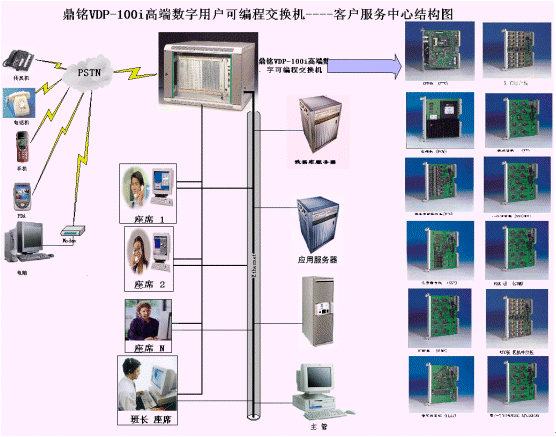 接入平臺實(shí)現(xiàn)外界接入的控制和話務(wù)交換、資源的合理分配,是構(gòu)建呼叫中心的成功關(guān)鍵所在。DM大型呼叫中心系統(tǒng)接入平臺采用鼎銘VDP-100i高端數(shù)字可編程交換機(jī),該交換機(jī)所有資源板卡都采用了高集成度、功能模塊設(shè)計(jì)思想。該接入平臺的結(jié)構(gòu)如上圖所示的右邊(詳細(xì)的功能模塊資源板請參閱《鼎銘高端數(shù)字可編程交換機(jī)產(chǎn)品手冊》),用戶可以根據(jù)實(shí)際情況靈活配置和增減系統(tǒng)的接入方式、資源類型、資源數(shù)量,達(dá)到資源的充分合理利用的目的。