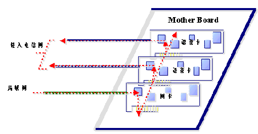 通過局域網(wǎng)傳遞語音數(shù)據(jù)本來就不能保證其時實(shí)時性,其結(jié)果就是用戶聽到的語音經(jīng)常斷續(xù),保證不了語音質(zhì)量。如果傳遞的語音數(shù)據(jù)是經(jīng)過壓縮的,語音數(shù)據(jù)本來就是通過TTS進(jìn)行合成的,再經(jīng)過壓縮,則音質(zhì)會有很大的損傷,因此同樣保證不了語音質(zhì)量。從上圖中我們可以看到,經(jīng)TTS合成的語音數(shù)據(jù)從局域網(wǎng)經(jīng)過網(wǎng)卡,再通過主板PCI(或ISA)總線進(jìn)入語音卡,最后進(jìn)入電信網(wǎng),同樣語音數(shù)據(jù)通過計(jì)算機(jī)主板經(jīng)PCI(或ISA)總線進(jìn)入語音卡也要求是實(shí)時的。這兩種實(shí)時性的要求會導(dǎo)致在接入量比較大的情況下,會給計(jì)算機(jī)的總線造成很大的負(fù)擔(dān)。因?yàn)榭偩的帶寬(數(shù)據(jù)吞吐量)是有限的。況且其它的板卡和接口(如聲卡、顯示卡等)也要直接或間接地占用總線。因此在接入量比較大的情況下,計(jì)算機(jī)的總線帶寬會成為一個比較關(guān)鍵的瓶頸。即便提高語音板卡的接入能力。在有大量電話接入的情況下,由于語音數(shù)據(jù)實(shí)時性的要求,也不能保證語音質(zhì)量。