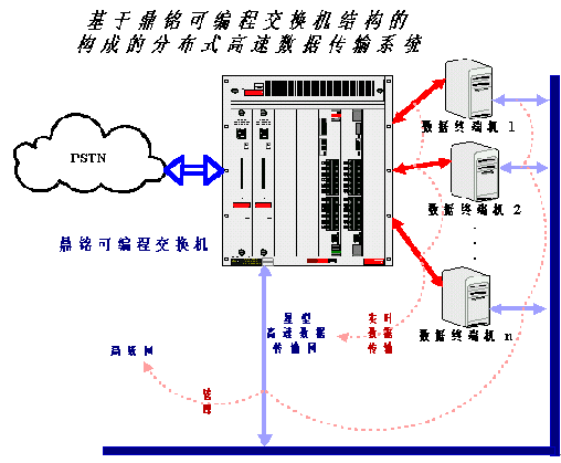 鼎銘高速數(shù)據(jù)傳輸板置于其可編程交換機(jī)內(nèi),外部可以和多臺PC或工控機(jī)相連,因?yàn)榭删幊探粨Q機(jī)可以級聯(lián),所以可以和外部連接的PC或工控機(jī)理論上沒有特別限制。這樣可編程交換機(jī)的內(nèi)部I/O總線(類比于PC機(jī)的PCI或ISA總線)就不再傳輸實(shí)時數(shù)據(jù)(如語音數(shù)據(jù)),而只負(fù)責(zé)非實(shí)時性的管理和信令數(shù)據(jù),語音或其它實(shí)時數(shù)據(jù)從外部PC直接傳入可編程交換機(jī)的高速數(shù)據(jù)傳輸板,然后通過交換直接進(jìn)入外部公共電信網(wǎng)(PSTN)。
