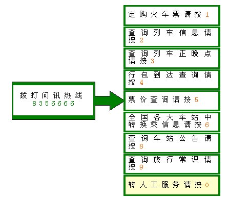 進(jìn)入系統(tǒng)后可以進(jìn)行定購火車票、查詢列車信息、查詢列車正晚點、行包到達(dá)查詢等操作。所有供查詢信息都由系統(tǒng)實時從數(shù)據(jù)庫中調(diào)用,由訊飛語音合成系統(tǒng)轉(zhuǎn)換成語音播放,不僅保證了信息的實時性,同時業(yè)務(wù)更加靈活,語音效果更好,系統(tǒng)的管理和維護(hù)也比以前便捷多了。