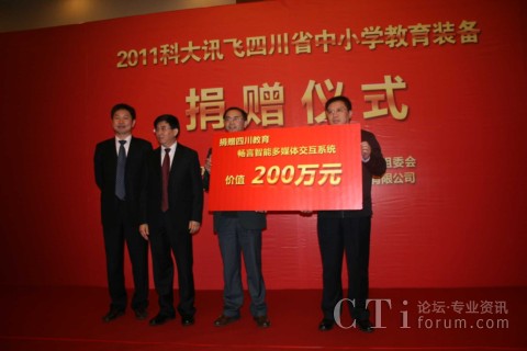 CTI論壇(ctiforum)11月11日消息(記者 潘婷婷): 2011年11月10日,科大訊飛在成都嬌子國際會議中心舉行了隆重的捐贈儀式,向四川省各市、地州中小學捐贈了價值200萬元的暢言系列教學產品。會議由四川省教育廳技術物資裝備處處長張生主持,四川省教育廳副廳長張林祥、科大訊飛副總裁徐玉林在儀式上致辭,來自各市、地州教育主管部門領導、各縣區(qū)教育局負責人、受贈學校教師代表,以及相關媒體共100多人等參加了捐贈儀式。