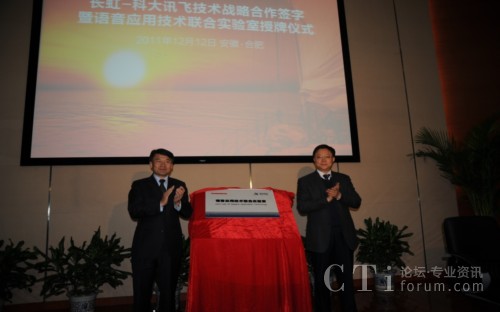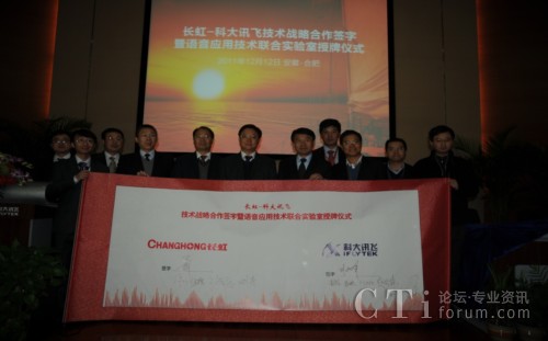 CTI論壇(ctiforum)12月14消息(記者 潘婷婷): 12月12日,科大訊飛與長虹集團戰(zhàn)略合作簽約暨共建聯(lián)合實驗室揭牌儀式在科大訊飛語音產(chǎn)業(yè)基地研發(fā)大樓隆重舉行。根據(jù)合作框架協(xié)議,雙方將在戰(zhàn)略聯(lián)盟的基礎(chǔ)上,以共建聯(lián)合實驗室為主要載體,旨在依托各自行業(yè)領(lǐng)域的長期積淀優(yōu)勢、強強聯(lián)合,達(dá)成戰(zhàn)略互信,加強緊密合作,積極推動“語音核心引擎+智能終端平臺” 的特色應(yīng)用模式,深入拓展智能語音科技在智能電視等終端產(chǎn)品市場的應(yīng)用范圍,合力開創(chuàng)智能語音終端創(chuàng)新應(yīng)用市場空間。