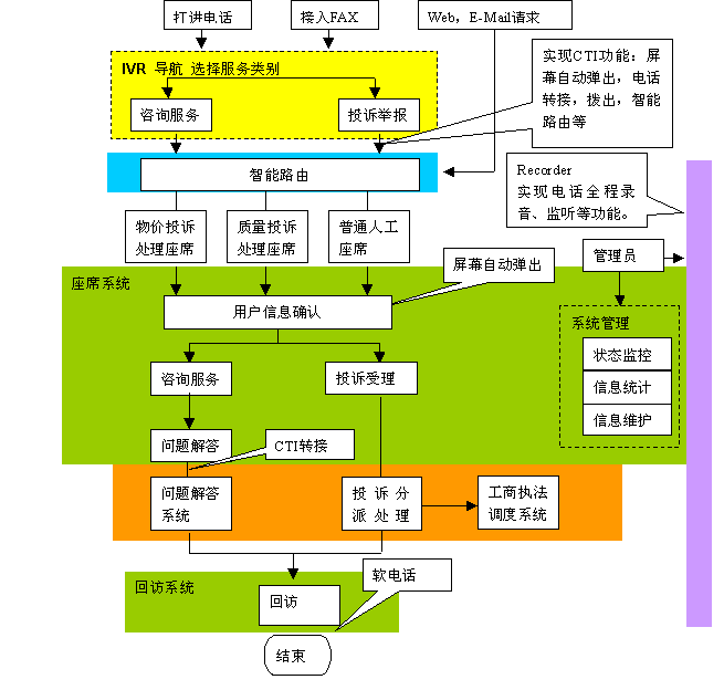 黎明網(wǎng)絡(luò)深入研究世界上最新的CTI技術(shù)的發(fā)展和應(yīng)用,自主研發(fā)推出的12315消費者投訴受理系統(tǒng)采用當前主流的一體化的呼叫中心模式。一體化的呼叫中心模式具有投資少、易于實施、維護工作量較小、維護成本低的優(yōu)點。該系統(tǒng)建立在內(nèi)部以太網(wǎng)基礎(chǔ)上,不同網(wǎng)絡(luò)(PSTN網(wǎng)、IP網(wǎng)、GSM/GPRS/CDMA網(wǎng))的消費者可以通過多種方式(電話、傳真、E-mail、短消息等)接入12315系統(tǒng),利用系統(tǒng)提供的服務(wù)進行投訴舉報或咨詢。