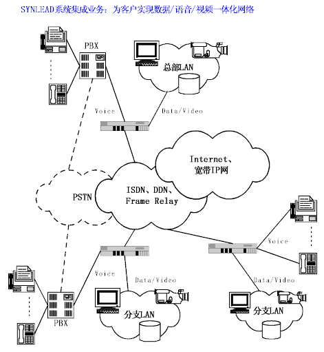 在這里,數(shù)據(jù)/話音/視頻一體化網(wǎng)絡主要是指多分支機構集團化企業(yè),通過ISDN、DDN、Frame Relay、Internet、寬帶IP等廣域網(wǎng)互聯(lián)手段,實現(xiàn)Data/Voice/Video"總線復用"的增值技術。