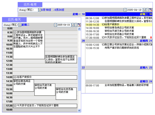 上圖"日歷管理"就借鑒了圖形化交互方法來安排日程和任務(wù)。這與您曾經(jīng)用過的桌面臺(tái)歷或記事本一樣,無需介紹就一目了然,并且要比在紙張上勾勾寫寫更方便、更有好處。例如,您此前計(jì)劃過日程,實(shí)際執(zhí)行有些變化,之后托托拽拽那個(gè)日程就可修改開始時(shí)間、持續(xù)時(shí)間,或修改主題內(nèi)容,有效提高了記錄工作日程的效率;又例如,可以根據(jù)需要設(shè)定"提醒"--即便對(duì)過期的、未及時(shí)處理的工作安排隨后也會(huì)提示,有了這樣的人性化服務(wù)助手,員工自然歡喜。