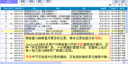 上圖"機(jī)會(huì)管理"表格窗口進(jìn)一步對(duì)人本化的管理方法進(jìn)行了舉例。在這里,您可直接對(duì)瀏覽到的字段進(jìn)行交互(是否能夠新建、修改、刪除,受管理授權(quán)或默認(rèn)授權(quán)約束),而不必一定要轉(zhuǎn)到另外的窗口才可操作字段。該方法在SynleadCRM中處處存在,它不僅僅為了提高工作效率,更讓企業(yè)在推行CRM管理變革時(shí)襯托出靈活性,而不是帶來了僵化。