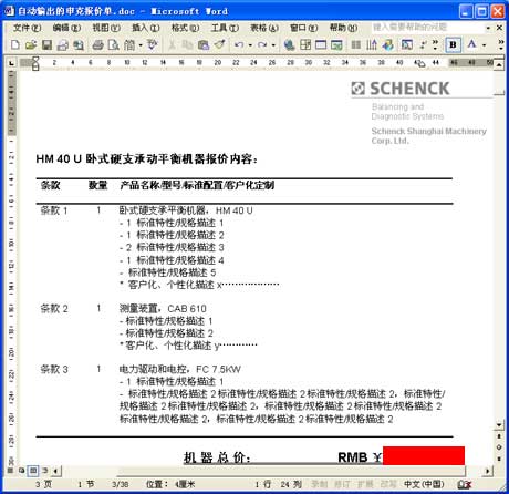 以上海申克的報價單為例。與其說它是一份報價單,不如說它是一套幾十頁的客戶化復雜方案書,它由各方面數(shù)據(jù)和文檔自動合并、輸出為一份Word文件: