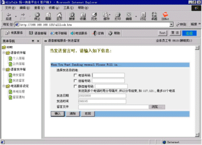 無響應(yīng)或者通話當(dāng)中無法響應(yīng)的電話,可以從PBX自動(dòng)傳送到AllyTalk語音郵件服務(wù)器。被傳送到AllyTalk語音郵件服務(wù)器去的來話者,聽到系統(tǒng)標(biāo)準(zhǔn)的、或者是用戶自己設(shè)定的應(yīng)答信息后,可以做消息錄音。AllyTalk語音郵件服務(wù)器使用對錄音文件的格式采用多種壓縮方式,可以根據(jù)磁盤容量、用戶需求選擇不同的語音文件格式。例如,1小時(shí)消息的容量可以為28.8M,也可以為14.4M。信箱的個(gè)數(shù)也沒有限制,錄音信息的最大數(shù)和最長時(shí)間僅受磁盤容量的限制。