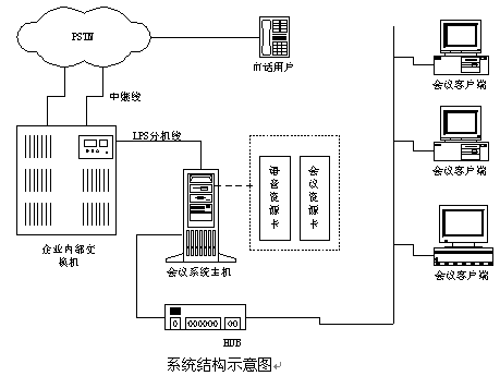 說明:如果沒有企業(yè)內(nèi)部程控交換機(jī)則可以將中繼線直接接在會(huì)議系統(tǒng)主機(jī)上,中繼線可以是普通模擬中繼,也可以是E1接口(如中國一號(hào)信令、30B+D等)。在與會(huì)議系統(tǒng)主機(jī)的同一網(wǎng)段上可以配置多個(gè)會(huì)議客戶端系統(tǒng),通過客戶端系統(tǒng)用戶可以隨時(shí)觀察和監(jiān)視會(huì)議系統(tǒng)的使用情況,并且可以建立常用用戶的用戶資料,也可以對(duì)常用用戶進(jìn)行分組,這樣要呼叫某些用戶開會(huì)時(shí)只需呼叫組用戶即可;