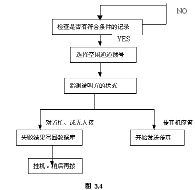 傳真發(fā)送功能是服務器后臺操作的,系統(tǒng)定時檢查傳真發(fā)送庫,一旦有符合條件的記錄,自動選擇空閑端口,按設定的傳真號碼撥號,檢查被叫方的狀態(tài),若對方有傳真機應答,則開始發(fā)送傳真;若對方忙、或無人接,系統(tǒng)稍后會再次試撥。若超過設定次數(shù)仍未發(fā)送成功,系統(tǒng)會通知發(fā)送人作其它處理。