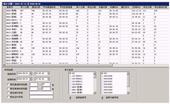 呼叫統(tǒng)計是呼叫中心最重要的功能。該呼叫中心系統(tǒng)設(shè)計了一整套豐富的呼叫統(tǒng)計管理工具,能有效地實現(xiàn)對業(yè)務(wù)、設(shè)備、人員的全面管理,使呼叫中心隨著運營的過程效益不斷地提高。同時提供實時的監(jiān)控工具,使管理人員及時了解整個系統(tǒng)的運行狀態(tài)。