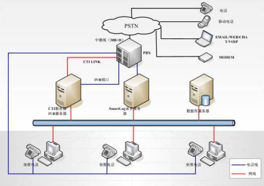呼叫中心前端通信平臺,主要由SIEMENS HiPath3800交換機,計算機電話集成服務器(UltraCTI),交互式語音應答服務器(ctsIVR),在線錄音監(jiān)聽服務器(SmartLog),數(shù)據(jù)庫服務器,MCI服務器以及傳真服務器幾個部分組成。中繼線采用30B+D接入。