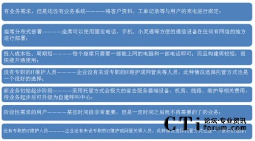 基于云計(jì)算(400+Saas)的ToneThink強(qiáng)訊托管型呼叫中心采用世界最先進(jìn)的呼叫中心核心技術(shù),企業(yè)無需投入任何軟件、硬件,即可根據(jù)業(yè)務(wù)需求立刻擁有一套自己的呼叫中心系統(tǒng),獲得呼入式、呼出式營銷服務(wù)帶來的超值回報(bào)。那么什么情況下您適合選用托管型的呼叫中心呢?