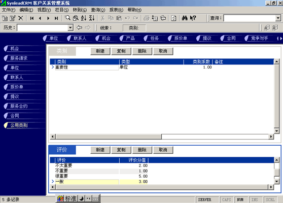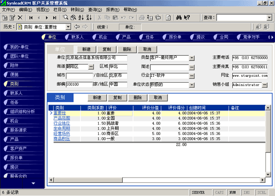客戶單位的分類較聯(lián)系人的分類更復雜。常用的分類有:按照企業(yè)規(guī)模來分類(大、中、小,層次自定義,下同)、按照該客戶與本單位的緊密程度分類(緊密、普通、疏遠)、按照該客戶的重要性分類(重要、普通、次要)、按照該客戶的忠誠度分類(忠誠、普通、游移)。有一些用戶企業(yè),希望對客戶單位特征進行采集,進而進行客戶信用評價。信用特征的類別可以多達數(shù)十種類(詳細情況可參考有關書籍)。利用SynleadCRM,您可以為每個類指定系數(shù),為類下屬的每個評價指定評分分值。例如,您可以建立一個類別為"客戶倉庫積壓商品的情況",系數(shù)為1,該類別下屬的評價有"很多1分"、"一般3分"、"少1分"、"未知0分",如果指定某客戶該類別的評價為一般,則該項目得分為3分*1(系數(shù))=3分。依此類推,您還可以指定更多的分類與評價,例如:客戶經(jīng)營場所所處的位置、客戶在企業(yè)生命周期中所處的位置、客戶在行業(yè)中的地位、客戶產(chǎn)品的組合情況、客戶產(chǎn)品覆蓋的市場范圍、客戶產(chǎn)品的淡旺季規(guī)律、客戶近年營業(yè)額的增減趨勢、客戶的年度營業(yè)額、客戶的現(xiàn)金周轉能力、客戶的負債情況、客戶是否涉及中大訴訟等。每一個類別項目的評分經(jīng)過系數(shù)的加權運算后,可以求和,得到這個客戶的總評分。未來也可以利用分析模型對此類數(shù)據(jù)進行進一步的分析,提供輔助決策所需要的圖表和報表。