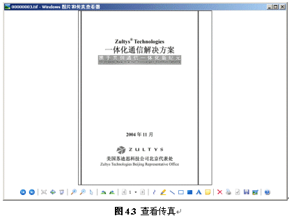 用戶可以顯示、保存、移動、刪除、復制傳真,也可以回撥傳真來電號碼。選擇顯示傳真時,系統(tǒng)自動調(diào)用圖片處理軟件打開傳真(不同的操作系統(tǒng)軟件或版本所帶軟件不同,下圖僅供參考)。
