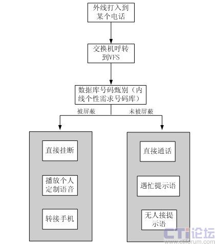外線(主叫)撥打某一電話(被叫),在經(jīng)過VFS系統(tǒng)數(shù)據(jù)庫甄別后,如果該外線(主叫)存在于主叫屏蔽號碼段的黑名單數(shù)據(jù)庫中,該外線(主叫)將會被系統(tǒng)自動屏蔽。如被屏蔽,則根據(jù)流程動作,可以播放提示音、轉(zhuǎn)接人工或者直接掛斷。