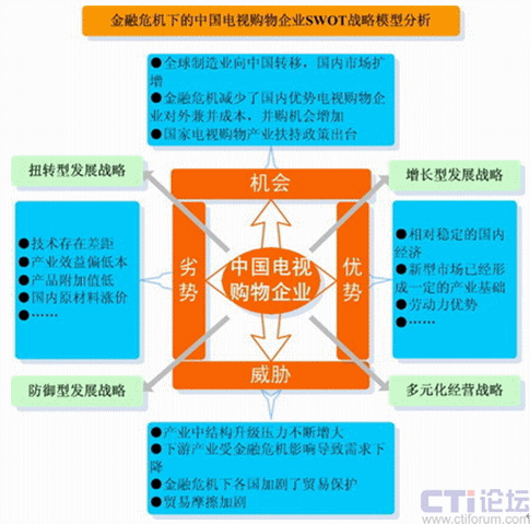 1992年至2009年以來,電視購物經(jīng)歷了從割據(jù)到統(tǒng)一,全國購物頻道網(wǎng)絡(luò)化;從粗放到科學(xué),頻道運(yùn)營模式專業(yè)化;從簡介到深度,頻道編排方式規(guī)律化、從滯后到及時(shí),物流配送體系成熟化。電視購物被譽(yù)為繼零售、超市之后的第三次銷售革命,電視購物將成為金融危機(jī)經(jīng)濟(jì)形態(tài)下未來中國電視新的經(jīng)濟(jì)增長點(diǎn),而付費(fèi)電視、數(shù)字網(wǎng)絡(luò)電視的發(fā)展,是中國電視購物市場新的戰(zhàn)略機(jī)會(huì)。金融危機(jī)下的中國電視購物企業(yè)SWOT戰(zhàn)略模型分析如下: