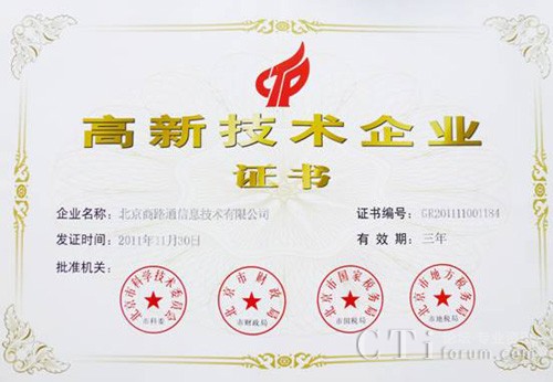 CTI論壇(ctiforum)3月23日消息(記者 浩宇):商路通再傳喜訊,2012年3月12日商路通獲得了“國(guó)家級(jí)高新技術(shù)企業(yè)”證書,(證書編號(hào):GR201111001184,有效期三年),這標(biāo)志著商路通發(fā)展的又一個(gè)新的里程碑。