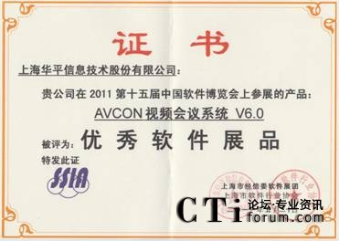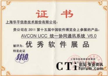 CTI論壇(ctiforum)6月1日消息(記者 潘婷婷): 近日,由工業(yè)和信息化部、國(guó)家發(fā)展和改革委員會(huì)、科學(xué)技術(shù)部、國(guó)家外國(guó)專家局和北京市人民政府共同主辦,中國(guó)軟件行業(yè)協(xié)會(huì)、中國(guó)電子信息產(chǎn)業(yè)發(fā)展研究院等單位承辦的第十五屆中國(guó)國(guó)際軟件博覽會(huì)參評(píng)軟件產(chǎn)品評(píng)獎(jiǎng)揭曉,經(jīng)過專家組的嚴(yán)格評(píng)審及在技術(shù)領(lǐng)先性、應(yīng)用價(jià)值等評(píng)審指標(biāo)下,由上海市經(jīng)信委軟件展團(tuán)及上海市軟件行業(yè)協(xié)會(huì)共同頒發(fā)華平股份優(yōu)秀組織獎(jiǎng),所參展的 “AVCON UCC統(tǒng)一協(xié)同通訊系統(tǒng)V6.0”、“AVCON視頻會(huì)議系統(tǒng)V6.0”兩款產(chǎn)品被評(píng)為優(yōu)秀軟件展品。