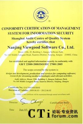 CTI論壇(ctiforum)07月17日消息: 日前,VIEWGOOD順利通過ISO27001信息安全管理體系國際認證,成為首家通過該項認證的專業(yè)流媒體技術(shù)供應(yīng)商。此舉標志著VIEWGOOD在保障信息安全、提升企業(yè)管理水平方面,已經(jīng)全面接軌國際水平,并居于業(yè)內(nèi)領(lǐng)先地位。