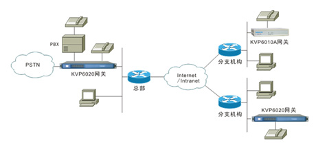 KVP6020采用模塊化設(shè)計,支持FXS、FXO、E&M、E1等多種語音模塊,最大可支持40路FXS用戶接口,可用于總部和大、中型分支機構(gòu),提供IP語音通信業(yè)務(wù),也可通過FXO、E&M、E1等中繼接口與PBX、與PSTN相連,提供中繼匯接業(yè)務(wù),典型應(yīng)用如下圖。