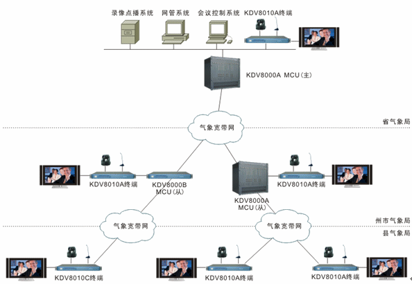 二期工程將實(shí)現(xiàn)州市到縣的建設(shè)。屆時(shí),州市氣象局既是省氣象局的遠(yuǎn)端節(jié)點(diǎn)又是縣氣象局的中心點(diǎn),可根據(jù)情況部署KDV8000A或KDV8000B多點(diǎn)控制單元,向上與省氣象局多點(diǎn)控制單元級聯(lián),向下與縣氣象局視頻會議終端相連。州市氣象局在一期工程中已配視頻會議終端,因此二期工程僅需在各縣氣象局部署KDV8010A或KDV8010C視頻會議終端各1臺即可,通過氣象寬帶網(wǎng)接入州市氣象局的多點(diǎn)控制單元。