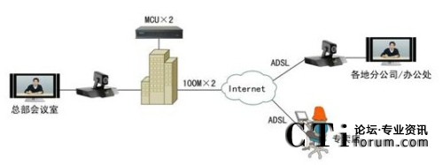 整個方案在部署上極其簡單,紅豆集團總部架設一臺KDV8000C多點控制單元和一臺KDV8000E多點控制單元,全國各地分公司/辦事處的會議室各部署一套TrueSens硬件視頻會議終端,而遍布全國的紅豆男裝專賣店、軒帝尼專賣店內則分別部署一套科達軟件視頻會議終端。集團總部采用電信、聯(lián)通的百兆寬帶各一條,各地的分支機構和專賣店則均通過普通的ADSL接入。系統(tǒng)拓撲圖如下: