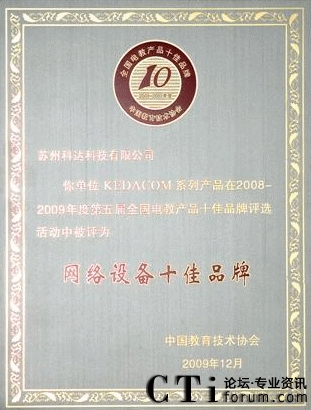 CTI論壇(ctiforum)12月14日消息(記者 張塵):2009年12月4日,由國(guó)內(nèi)教育權(quán)威機(jī)構(gòu)“中國(guó)教育技術(shù)協(xié)會(huì)”主辦,以讀者調(diào)查問(wèn)卷的形式舉行的第五屆全國(guó)電教產(chǎn)品十佳品牌頒獎(jiǎng)典禮在福州梅峰賓館盛大開(kāi)幕,科達(dá)教育視頻會(huì)議產(chǎn)品憑借卓越的產(chǎn)品性能和良好的客戶(hù)服務(wù)入選網(wǎng)絡(luò)產(chǎn)品類(lèi)十佳之列,同時(shí)也成為首個(gè)入選十佳品牌的視頻會(huì)議產(chǎn)品。