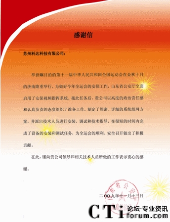 CTI論壇(ctiforum)12月29日消息(記者 張塵):日前 ,山東省公安廳向蘇州科達(dá)科技有限公司發(fā)來(lái)感謝信,對(duì)蘇州科達(dá)為保障全運(yùn)會(huì)順利、安全召開(kāi)所做的貢獻(xiàn)表示衷心的感謝。