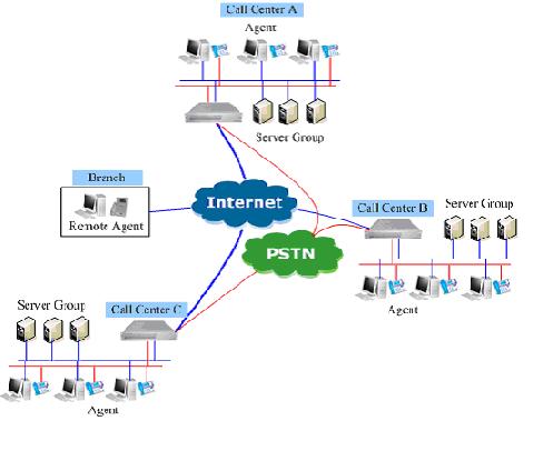 圖析:上圖中,整個(gè)分布式呼叫中心系統(tǒng)由三個(gè)獨(dú)立呼叫中心以及遠(yuǎn)端座席構(gòu)成,彼此都通過Internet或者其它網(wǎng)絡(luò)互連。三個(gè)呼叫中心每個(gè)都是獨(dú)立完整的呼叫中心,在任何時(shí)候,都可以獨(dú)立工作,遠(yuǎn)程座席則要注冊到某一呼叫中心上。