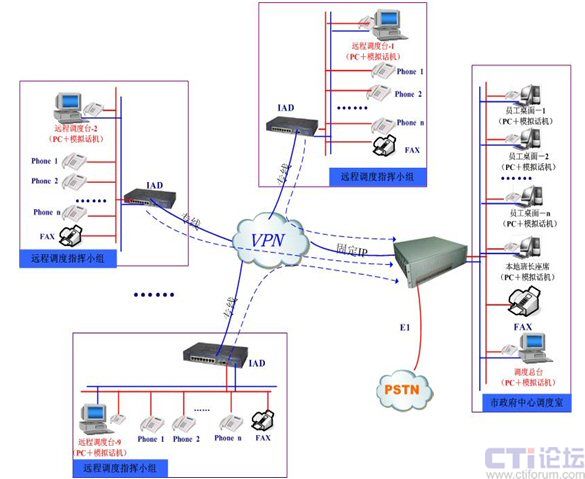本次項(xiàng)目中,融天科技為大連市政府部署的防火調(diào)度指揮系統(tǒng)涉及點(diǎn)包括市政府中心調(diào)度室和分布在大連市各轄區(qū)的9個(gè)遠(yuǎn)程指揮小組,中心調(diào)度室通過(guò)RT-CCP1000一體化調(diào)度平臺(tái)部署10個(gè)中心調(diào)度值班員,轄區(qū)的9個(gè)遠(yuǎn)程指揮小組通過(guò)大容量IAD設(shè)備和政府VPN專網(wǎng)遠(yuǎn)程注冊(cè)到中心調(diào)度室RT-CCP1000平臺(tái)上,同時(shí)RT-CCP1000平臺(tái)與本地的PSTN通過(guò)一條數(shù)字中繼E1連接,作為系統(tǒng)的出入口。如下圖所示: