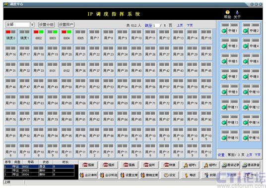 在此界面中實(shí)現(xiàn)了配置管理功能和呼叫相關(guān)功能。配置管理分為:設(shè)置、修改和刪除分組,設(shè)置用戶,設(shè)置中繼,翻頁(yè)等功能;呼叫相關(guān)功能:強(qiáng)接、強(qiáng)拆、強(qiáng)插、監(jiān)聽(tīng)、轉(zhuǎn)接、組呼、設(shè)定等級(jí)、設(shè)定權(quán)限、設(shè)定夜服、會(huì)議相關(guān)等功能。另外,可以在本軟調(diào)度系統(tǒng)中檢索瀏覽相關(guān)通話記錄,并可對(duì)錄音進(jìn)行回放。